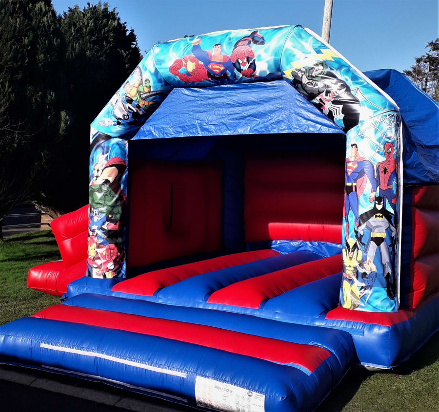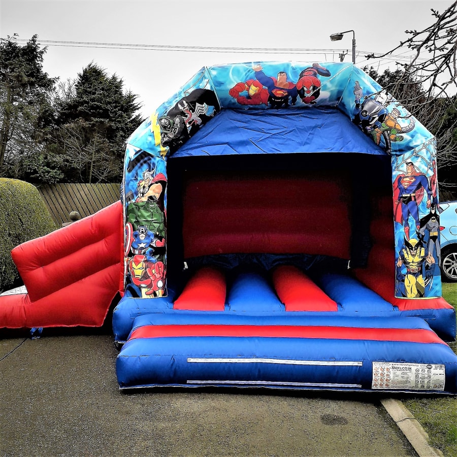 Our 17ft x 15ft Super Heros Banner Castle has a slide and a large open bounce area which will keep guests entertained for the duration of the party.