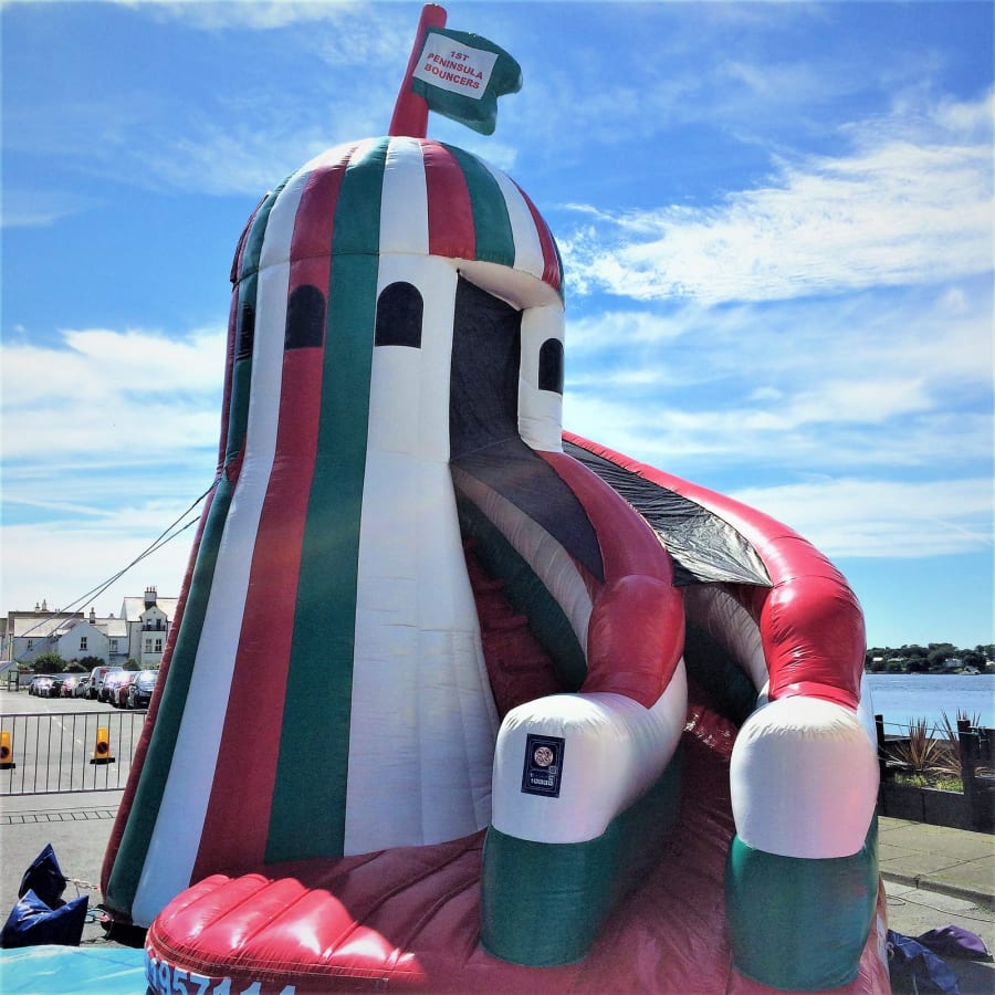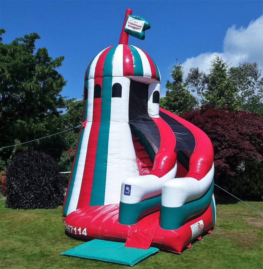Our 18ft x18 Helter Skelter Slide Inflatable stands at 24ft high with steps and hand holds winding up to a 10ft platform which sweeps you back down to earth!.